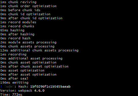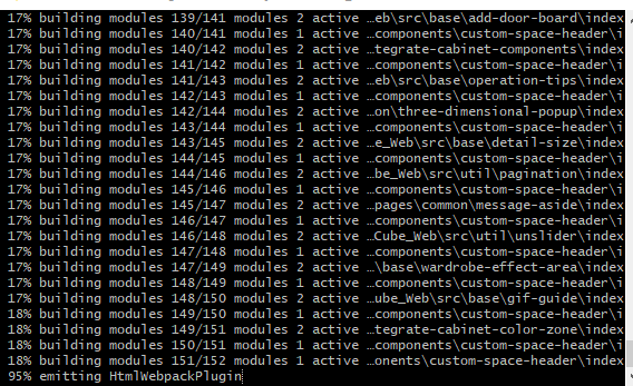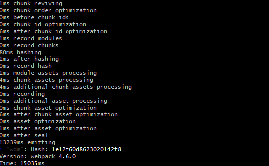 停止npm,重新运行webpack-dev-server,修改下文件按保存,观察控制台,发现总花费时长为15035毫秒,在emitting就花费了13239毫秒,这emitting应该就是指上面的图片的emitting HtmlWebpackPlugin了,看来我们解决HtmlWebpackPlugin,热加载速度就能恢复正常了。