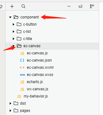 1.下载好之后,把里面的ec-canvas文件夹复制到项目中,如:在项目中建立一个文件夹component ,然后把ec-canvas放到component文件夹里面。