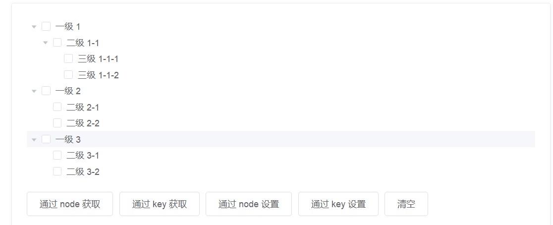 | setChecked | 通过 key / data 设置某个节点的勾选状态,使用此方法必须设置 node-key 属性 | (key/data, checked, deep) 接收三个参数,1. 勾选节点的 key 或者 data 2. boolean 类型,节点是否选中 3. boolean 类型,是否设置子节点 ,默认为 false |