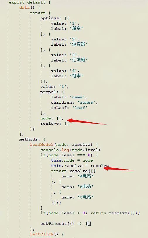 我们可以看到,传递给loadNode1方法有两个参数,this.node和this.resolve,这两个参数都是树形控件顶层节点属性数值。那么,是如何获取到这两个参数数值的呢?具体方法是:首先,申明node和reslove两个变量用于保存顶层节点的node和reslove数值。然后,在树形控件加载时将node.level===0情况下的node和reslove数值保存。如下图所示: