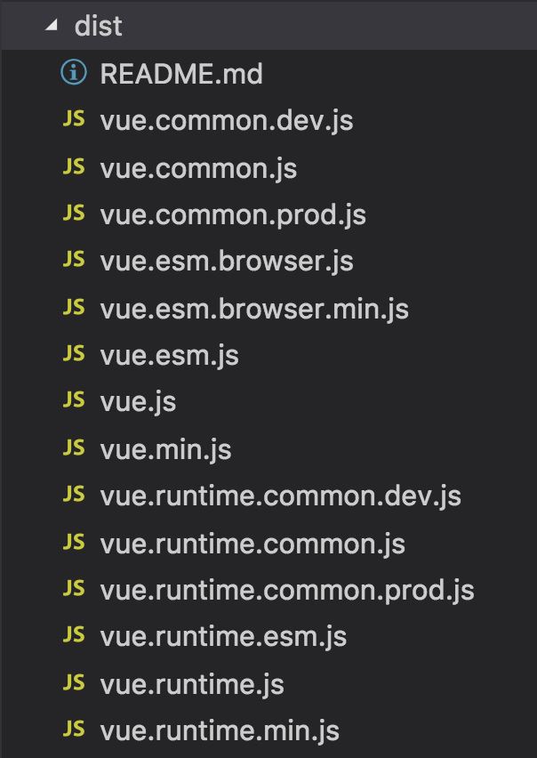 可以看到,dist下有10几种不同版本的vue文件,他们是根据不同规范(包括 CommonJS规范,ES Module,UMD)和 是否包含编译器 构建出的不同版本。