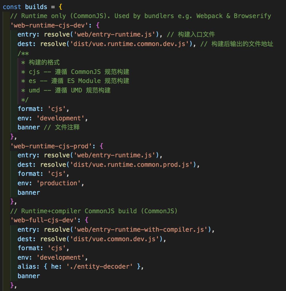 从代码可以看出,首先通过 script/config.js 文件的getAllBuilds方法获取配置,然后根据构建命令传入的参数对配置进行过滤,最后根据过滤后的配置执行build函数,编译出对应版本的vue文件。(这里介绍代码构建的过程,主要说明vue是怎么构建出不同版本代码的,build方法在此不做分析)