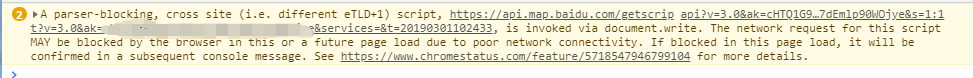 可以得知正是这段代码中的 document.write 引发的警告。那么我们在HTML文件中直接使用 <script type="text/javascript" src="https://zhanzhang360.qulang.net/imgupload/005895/getscript?v=3.0&ak='您的密钥'&services=&t=20190301102433"> </script> 导入百度地图的API就可以避免此警告。不过这样导入时,缺失的另外两行 window.BMAP_PROTOCOL = "https" 与 window.BMap_loadScriptTime = (new Date).getTime() 一定要记得添加到项目中,避免产生其他问题。