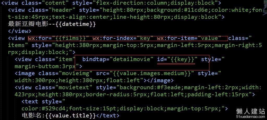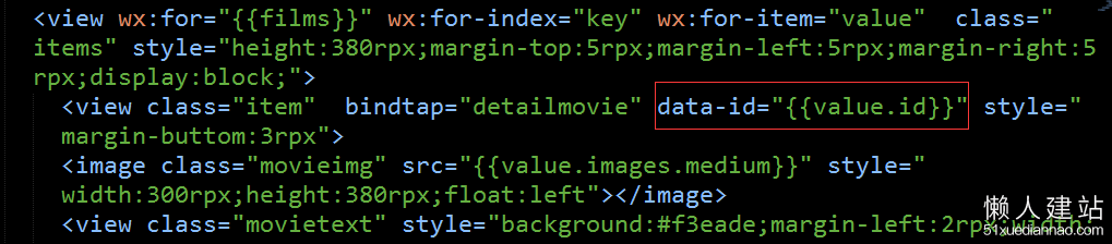在要跳转的item处,设置一个id并给当前的id赋值上对应的key值,比如一部电影的id(后面带着id去下一个页面查询,详细信息)如: