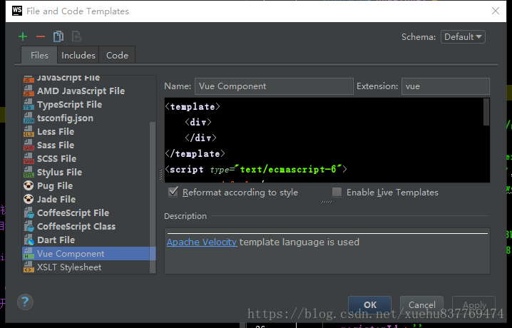 然后点击apply,再点击ok即可。现在我们再次点击左上角File->New,可以看到刚才创建的vue template已经出现了。我们点击vue template,名称填写test,可以看到新创建的文件就是刚才我们创建的模版的样子,如图。