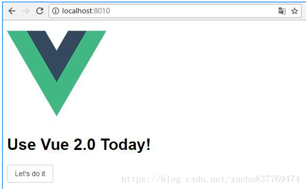 我们输入npm run dev后,会出现一长串信息,最后会出现webpack: Compiled successfully的字样,代表我们的代码编译成功。这时我们打开浏览器,输入localhost:8010,出现如图所示的网页,表示我们的第一个Vuejs2.0 +ElementUI工程已经成功运行。
