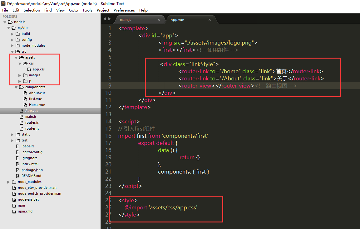 2,在App.vue中,写入两个跳转链接(router-link),分别跳转到“home”“About” (home、About即分别是两个组件)