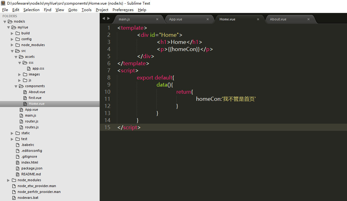 4,新建Home组件,并写入内容,About同理。
