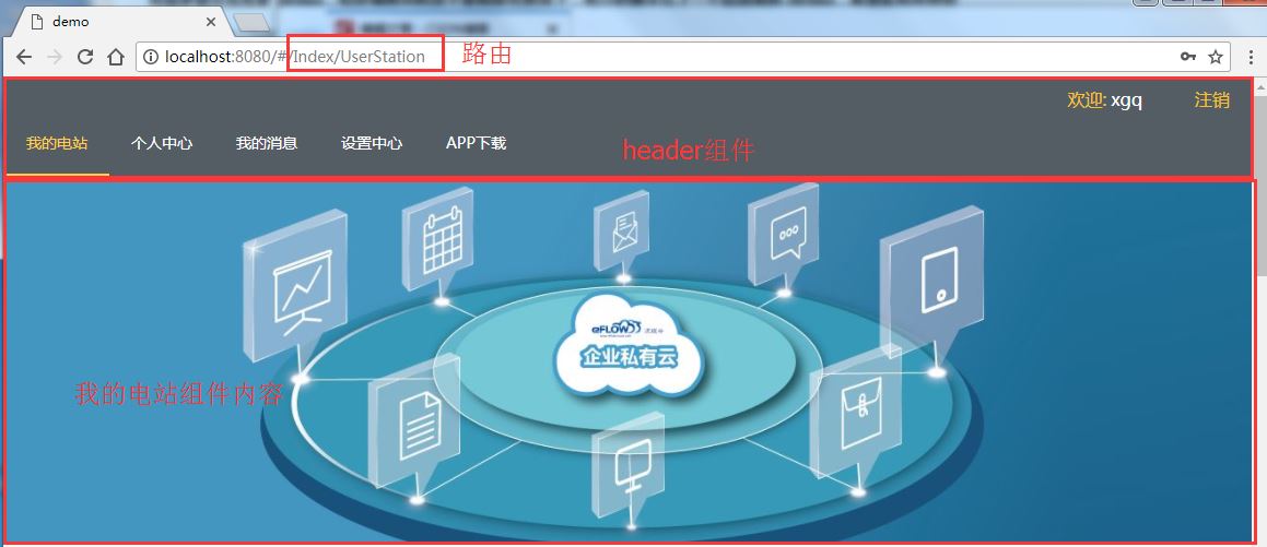 图中菜单区域为header公用组件,点击相应的菜单选项跳转到对应的路由,在菜单下区域加载相应组件的内容。