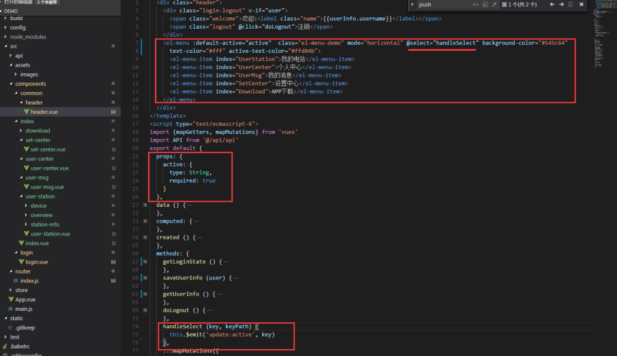 基于Element-ui(只需要留意红框部分):Element-ui知识请参考Element-ui官网,handleSelect函数调用时,告知父组件props中的active已经更新。