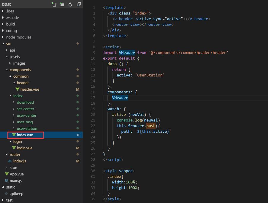 解释:index.vue中引用header组件,并向header组件传入active,此active在子组件中需要被修改,因此需要使用.sync实现props在header组件与index组件中共享,.sync相关知识可查询vuejs官网。