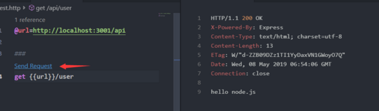 新建一个 test.http 文件测试接口,点击 Send Request 发送请求