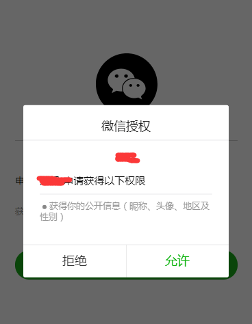 但在实际开发中我们可能需要弹出授权询问框,因此需要我们自己来写模拟授权弹框(主要是对<buttonopen-type="getUserInfo"></button>的包裹+用户是否是第一次授权判断来显示该页面),代码如下: