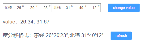 修改子组件值 父组件的value会改变,修改父组件的value,子组件会自动修改, [change value] 按钮 可以修改value [refresh] 按钮 通过ref获取度分秒格式的经纬度