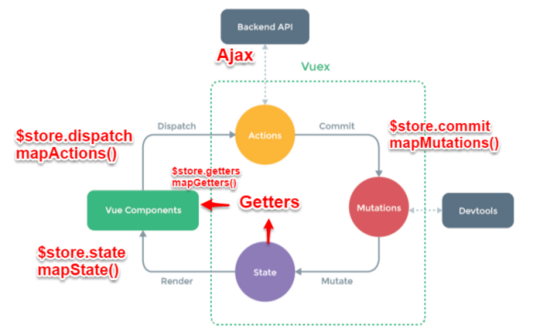 getters:state对象读取方法。图中没有单独列出该模块,应该被包含在了render中,Vue Components通过该方法读取全局state对象。