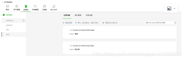 点击云开发 , 打开云开发控制台,云开发控制台提供如下能力(云函数中对数据库的操作等同于在控制台直接操作数据库)