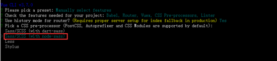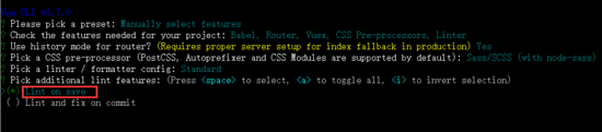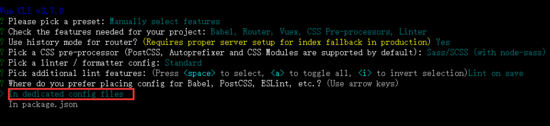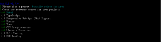 此处选择的是:Babel编译、Vue路由、Vue状态管理器、CSS预处理器、代码检测