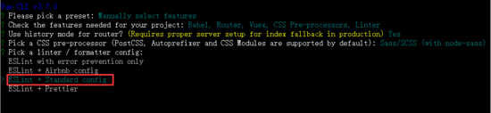 e、选择ESLint的代码规范,此处使用 Standard代码规范