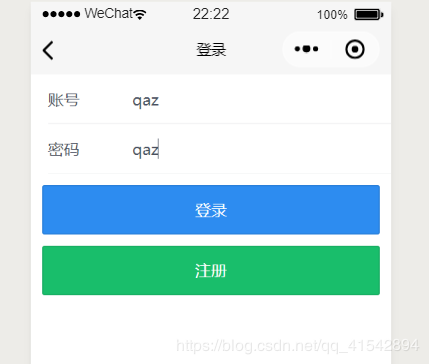 <!--pages/login/login.wxml--> <view> <i-input bind:change='inputName' maxlength="15" title="账号" placeholder="请输入账号" /> <i-input bind:change='inputPassword' maxlength="15" title="密码" placeholder="请输入密码" /> <i-button bindtap='login' type="primary">登录</i-button> <i-button bindtap='register' type="success">注册</i-button> </view>