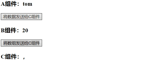 <script> var Event = new Vue();//定义一个空的Vue实例 var A = { template: '#a', data() { return { name: 'tom' } }, methods: { send() { Event.$emit('data-a', this.name); } } } var B = { template: '#b', data() { return { age: 20 } }, methods: { send() { Event.$emit('data-b', this.age); } } } var C = { template: '#c', data() { return { name: '', age: "" } }, mounted() {//在模板编译完成后执行 Event.$on('data-a',name => { this.name = name;//箭头函数内部不会产生新的this,这边如果不用=>,this指代Event }) Event.$on('data-b',age => { this.age = age; }) } } var vm = new Vue({ el: '#itany', components: { 'my-a': A, 'my-b': B, 'my-c': C } });