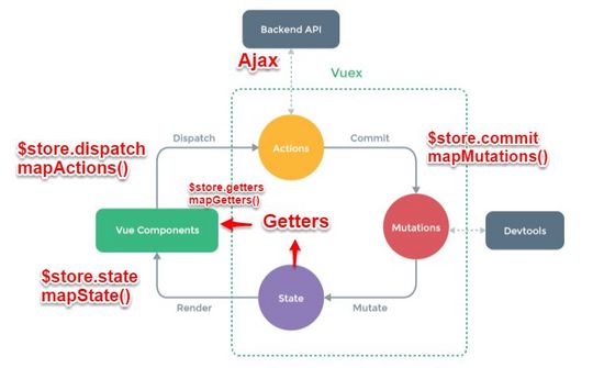 getters:state对象读取方法。图中没有单独列出该模块,应该被包含在了render中,Vue Components通过该方法读取全局state对象。
