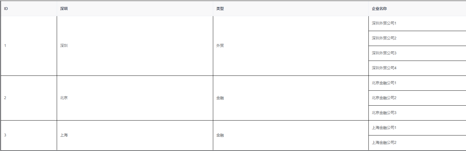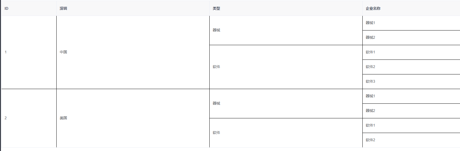 <el-table :data="tableData6" :span-method="arraySpanMethod" border style="width: 100%"> <el-table-column prop="id" label="ID" width="180"> </el-table-column> <el-table-column prop="region" label="深圳"> </el-table-column> <el-table-column prop="type" label="类型"> </el-table-column> <el-table-column prop="company" label="企业名称"> </el-table-column> </el-table>