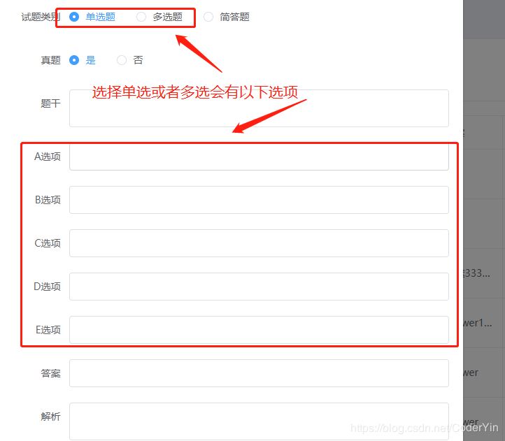1、在用户选择单选或多选时会有A,B,C,D,E五个选项