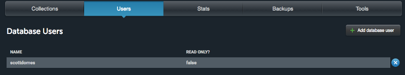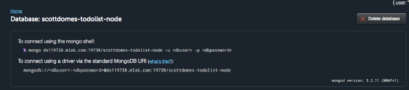 别忘了把你的用户名和密码(来自数据库用户的密码,而不是你的 mLab 帐户)添加到URL中。 (如果你要将此项目提交到 Github 上,请确保包含 .gitignore 文件 像这样,,不要与任何人分享你的密码。)