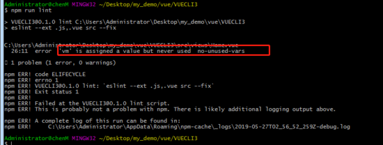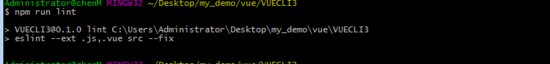 上面的 "lint": "eslint --ext .js,.vue src" 修改为 eslint --ext .js,.vue src --fix
