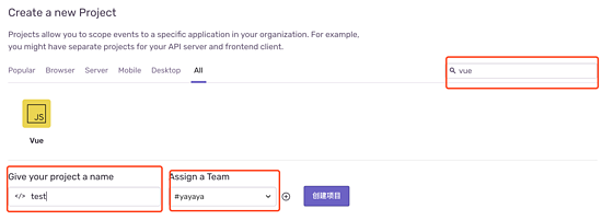 1.首先需要在 sentry 的官网注册一个账号。注册完选择新建一个项目, sentry 支持多种框架,在其中选择 vue 创建项目。我创建了一个名为test的项目。
