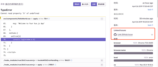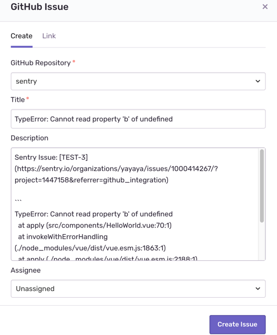 这样在该异常的详情页就可以创建issue到 sentry 这个仓库了。
