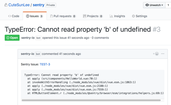 打开 github ,在 sentry 这个仓库下,发现多了一个issue,就是刚才我们创建的。