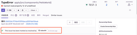 这样在下次发版 build 的时候, sentry 会自动将该异常的状态从 unresolved 变成 resolved ,并会给出本次提交的 diff 地址。