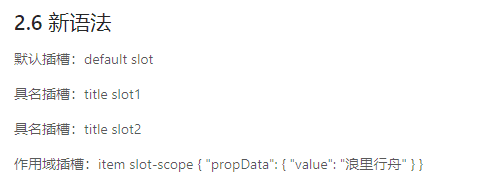 我们通过一个例子介绍下默认插槽、具名插槽和作用域插槽的新语法: