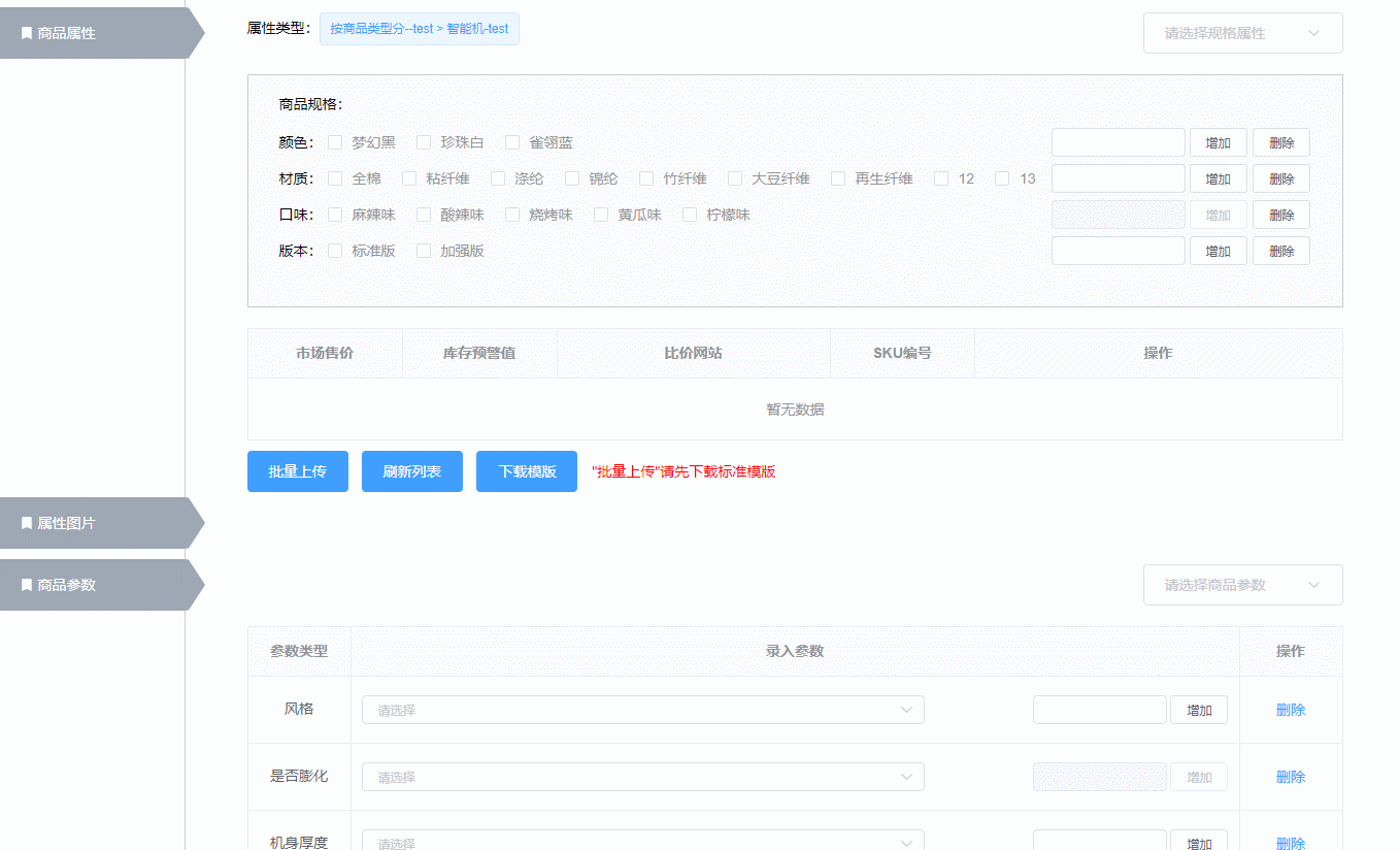 这个相对来说比较麻烦,还涉及到了下面“属性图片”的循环,但关键点还是在SKU组合的代码上面