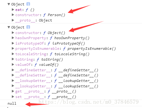 per实例对象的__proto__ ---指向---> Person.prototype的__proto__ ---指向---> Object.prototype的__proto__ 是Null