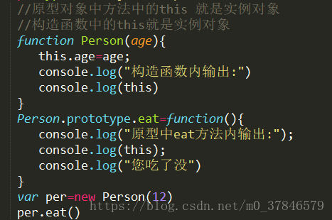 并且在Person 的原型对象上添加了一个eat 方法,也输出了一个this,