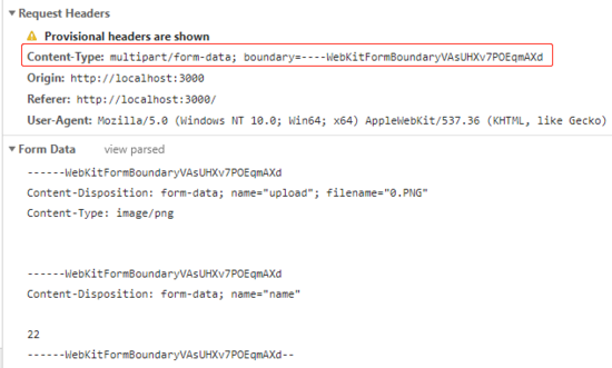 使用表单上传文件时,必须指定表单的 enctype 属性值为 multipart/form-data . 请求体被分割成多部分,每部分使用 --boundary 分割开始,紧接着内容描述信息,最后是字段具体内容(文本或二进制);如果传输的是文件,还要包含文件名和文件类型信息;