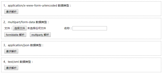 本文我们主要介绍 Post 请求的 4 种 Content-Type 数据类型,以及如何使用 Express 来对每种 Content-Type 类型进行解析。已经将完整的代码实例上传到 github , github 地址为:https://github.com/fengshi123/request_example,欢迎 star 。 demo 截图如下所示:
