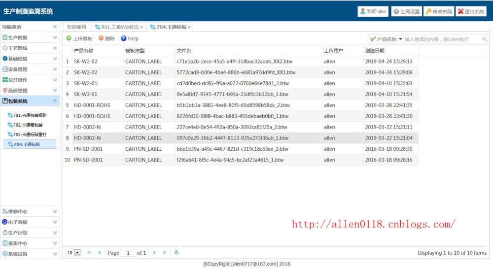通常情况下,操作员会扫描多个彩盒条码,这个扫描的数量一个到多个不等,每一个彩盒上面都有一个唯一的条形码或二维码,当彩盒扫描完成以后需要结束装箱,此时系统应该直接将对应的卡通标贴打印出来,操作员从打印机上撕下卡通标贴并贴于卡通箱,在此之前我们需要提前将卡通标贴的打印模板制作出来并上传至系统中,操作界面如下,支持同一个产品打印多张标贴: