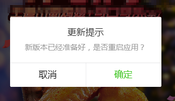 如图,当小程序发布新的版本后,用户如果之前访问过该小程序,通过已打开的小程序进入(未手动删除),则会弹出这个提示,提醒用户更新新的版本。用户点击确定就可以自动重启更新,点击取消则关闭弹窗,不再更新。
