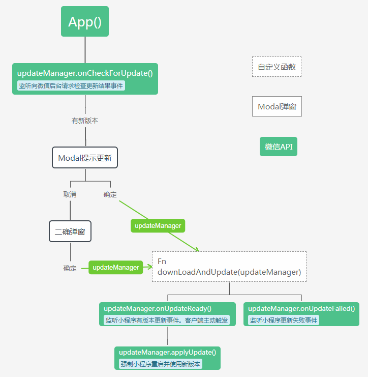 如上,在检测到小程序有新版本之后,就给出弹窗提示用户下载新版并重启小程序,用户点击确定按钮后进行小程序新版本的下载和更新。也为了调用方便,将新版本下载及小程序的重启应用单独封装起来。