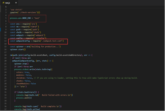 Step2、在在build文件夹中新建test.js,内容可以直接拷贝同目录build.js内容,修改一些参数 这样就多了个test环境