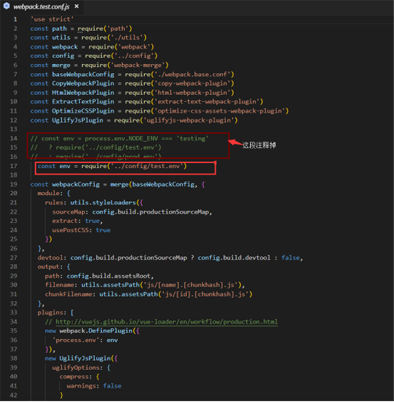 Step3、 在build文件夹中新建webpack.test.conf.js,内容可以直接拷贝同目录webpack.prod.conf.js内容,修改一些参数。