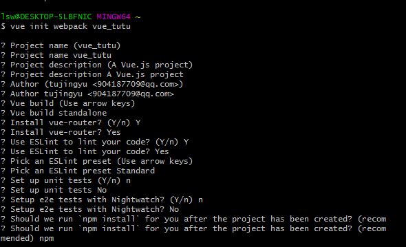 使用vue init webpack vue_test(vue_test为项目名称)创建项目,然后根据需要来选择,