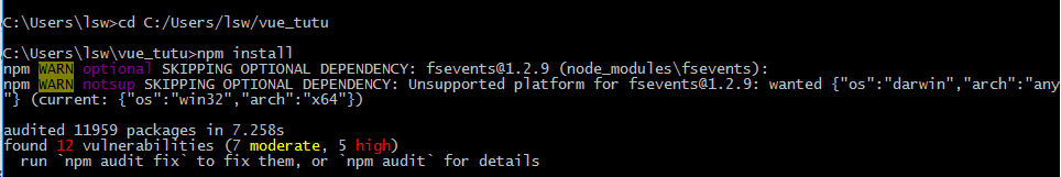审核了11959个包发现12个漏洞(7个中等,5个高危)运行`npm audit fix`来修复它们,