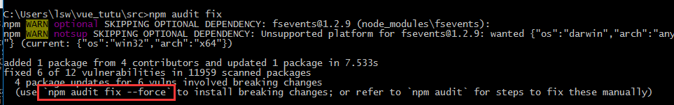 接着会出现下图所示,告知你已修复其中一些漏洞,还需输入npm audit fix --force 进一步修复