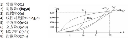 常见的算法时间复杂度由小到大依次为: Ο(1)<Ο(log 2 n)<Ο(n)<Ο(nlog 2 n)<Ο(n 2 )<Ο(n 3 )< Ο(n k ) <Ο(2 n ) ,随着问题规模n的不断增大,上述时间复杂度不断增大,算法的执行效率越低