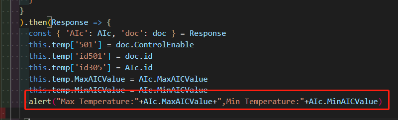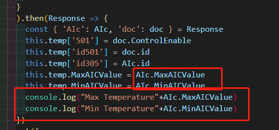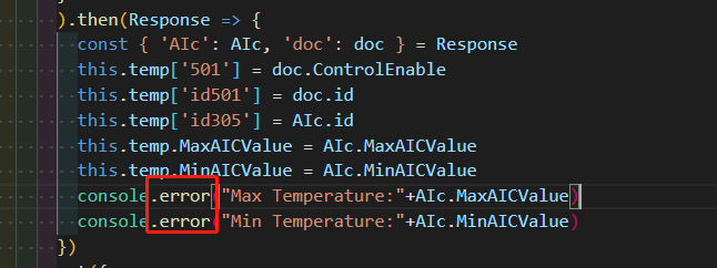 在代码中添加console.log()方法,这里例子输出从数据库读回来的最高最低温,详见如下: