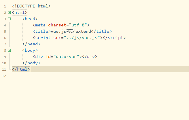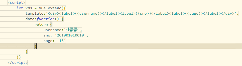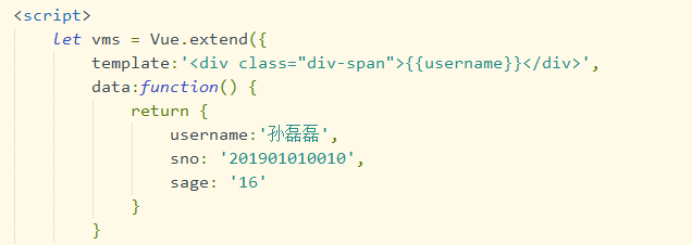 第二步,在<script></script>标签中调用Vue.extend(),设置template和data,如下图所示:
